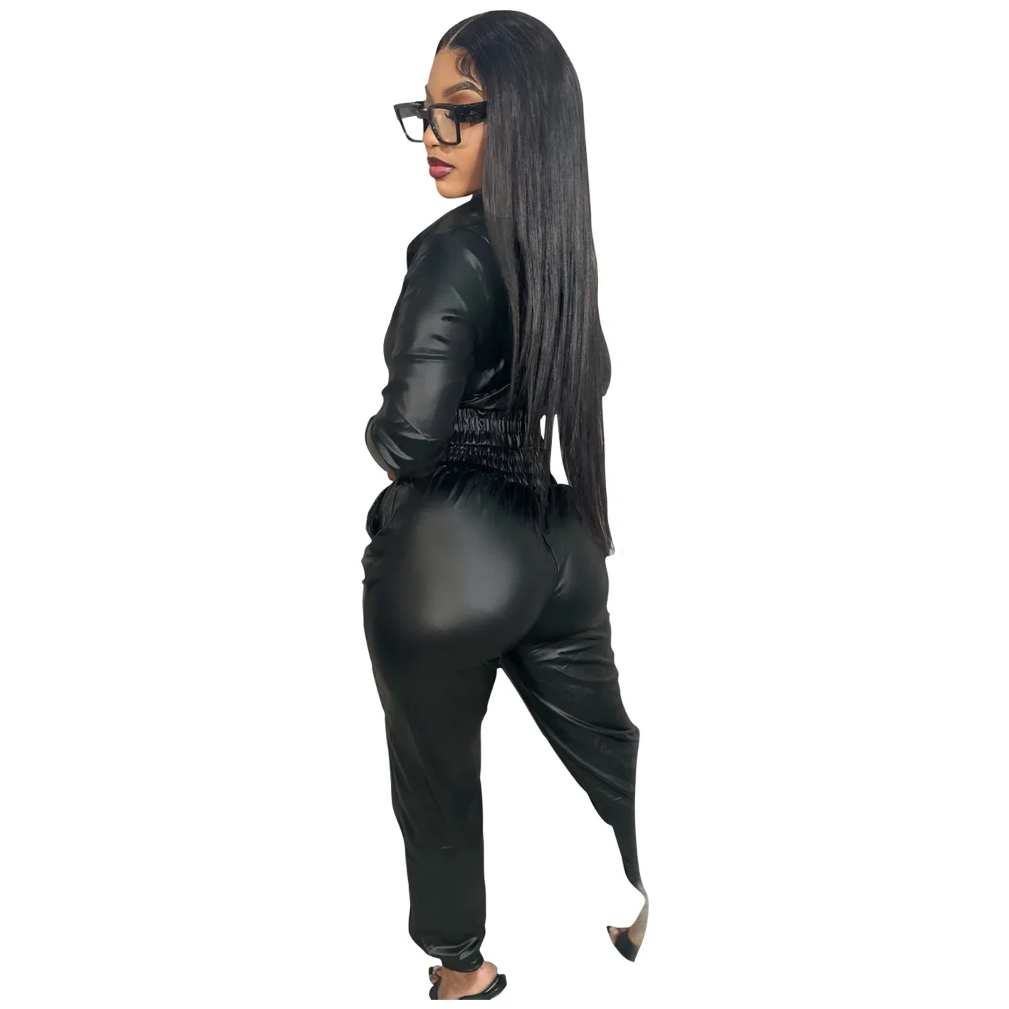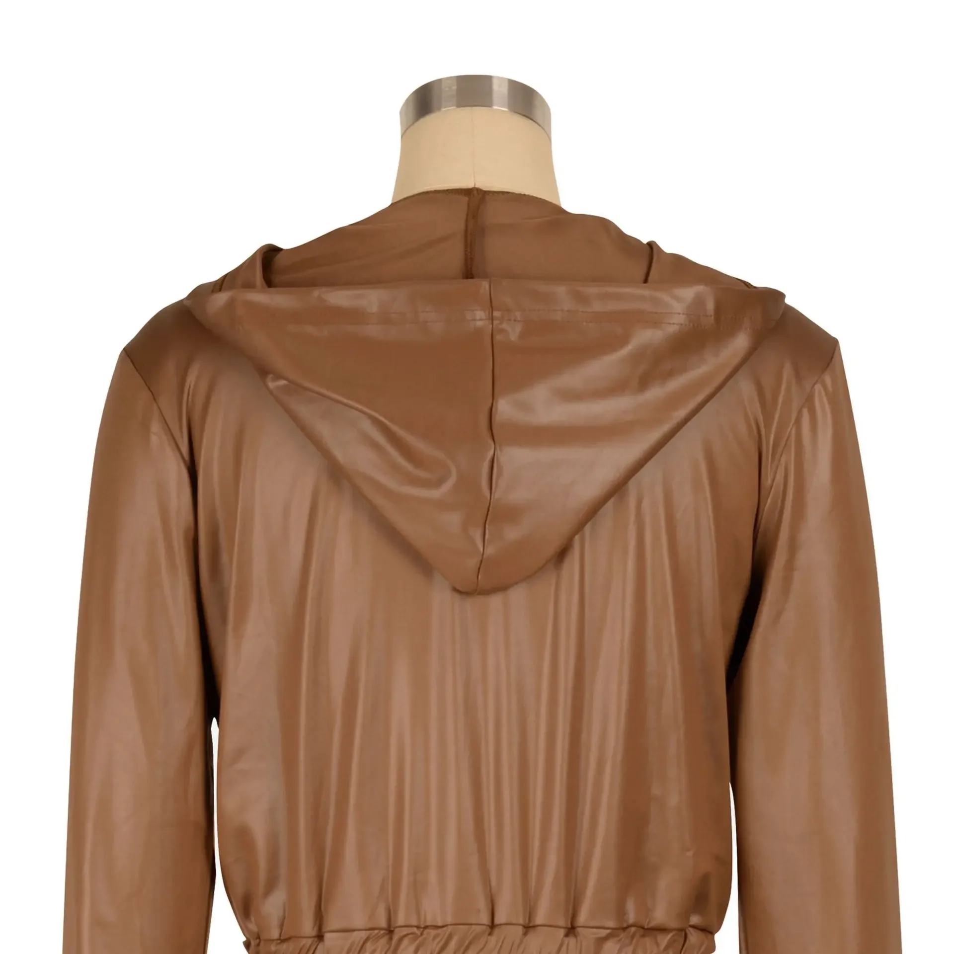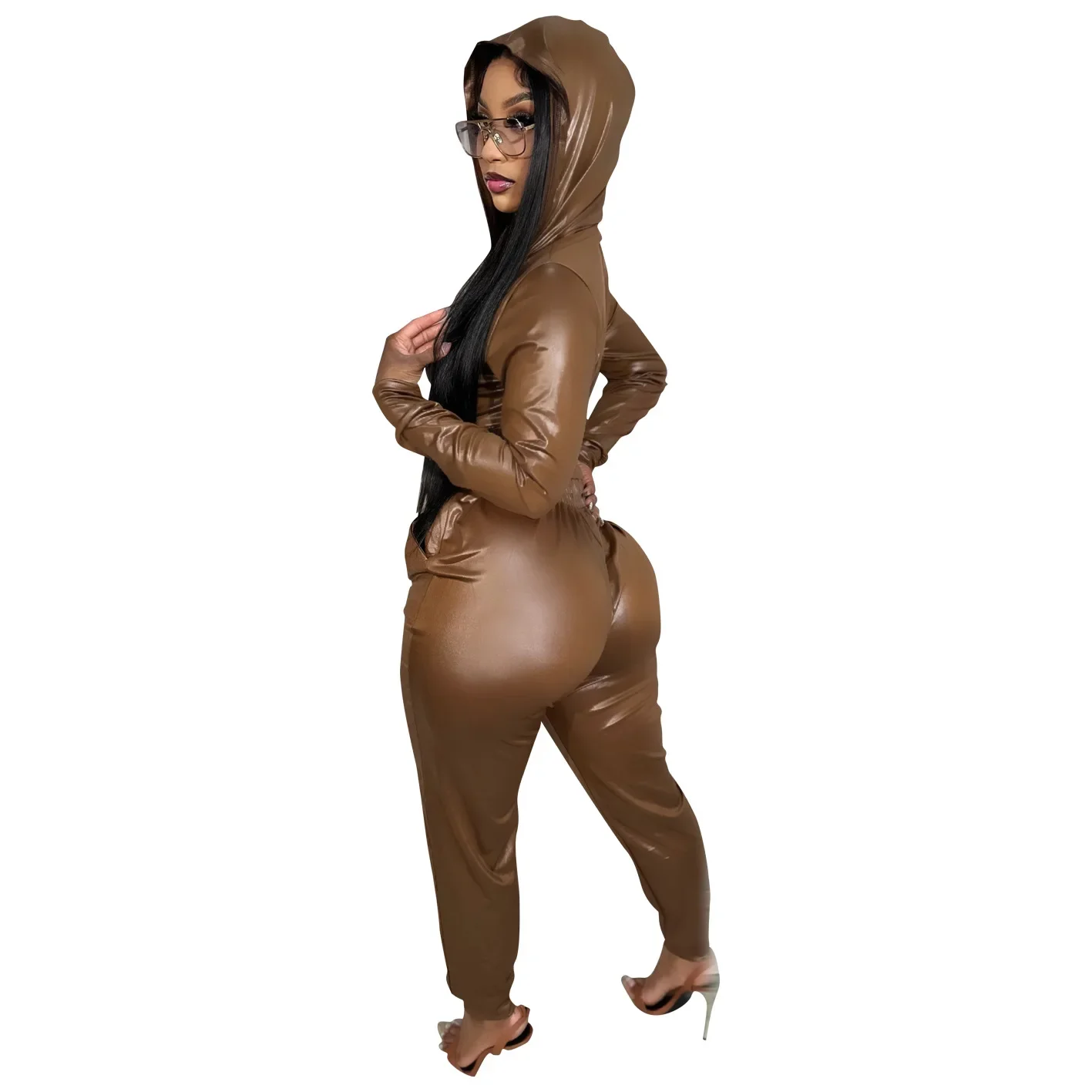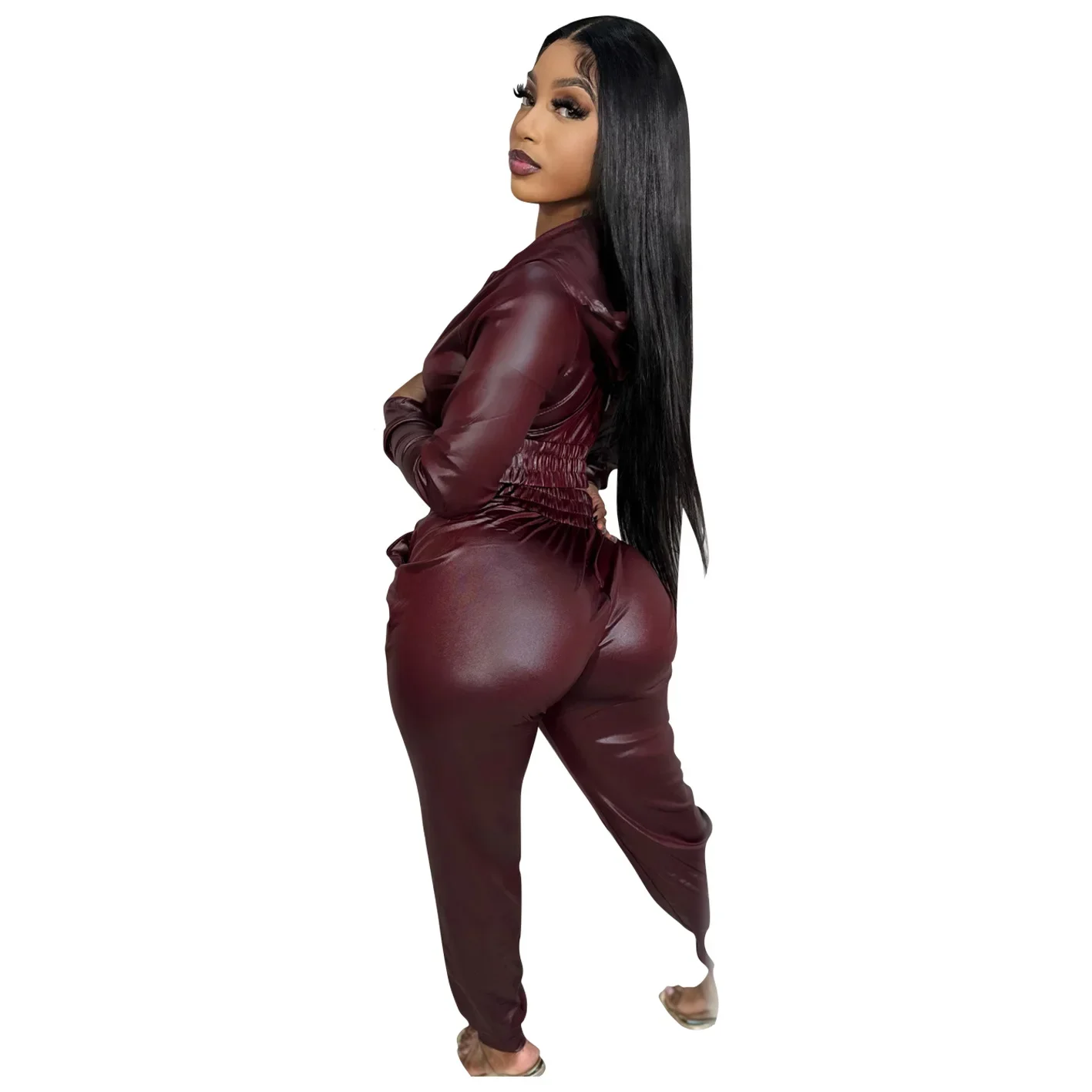 Elevate your street style with our exclusive Chic PU Faux Leather Two Piece Set! This matching set features a long sleeve, zipper hooded jacket and sleek pants, a perfect ensemble for any fashion-forward woman.