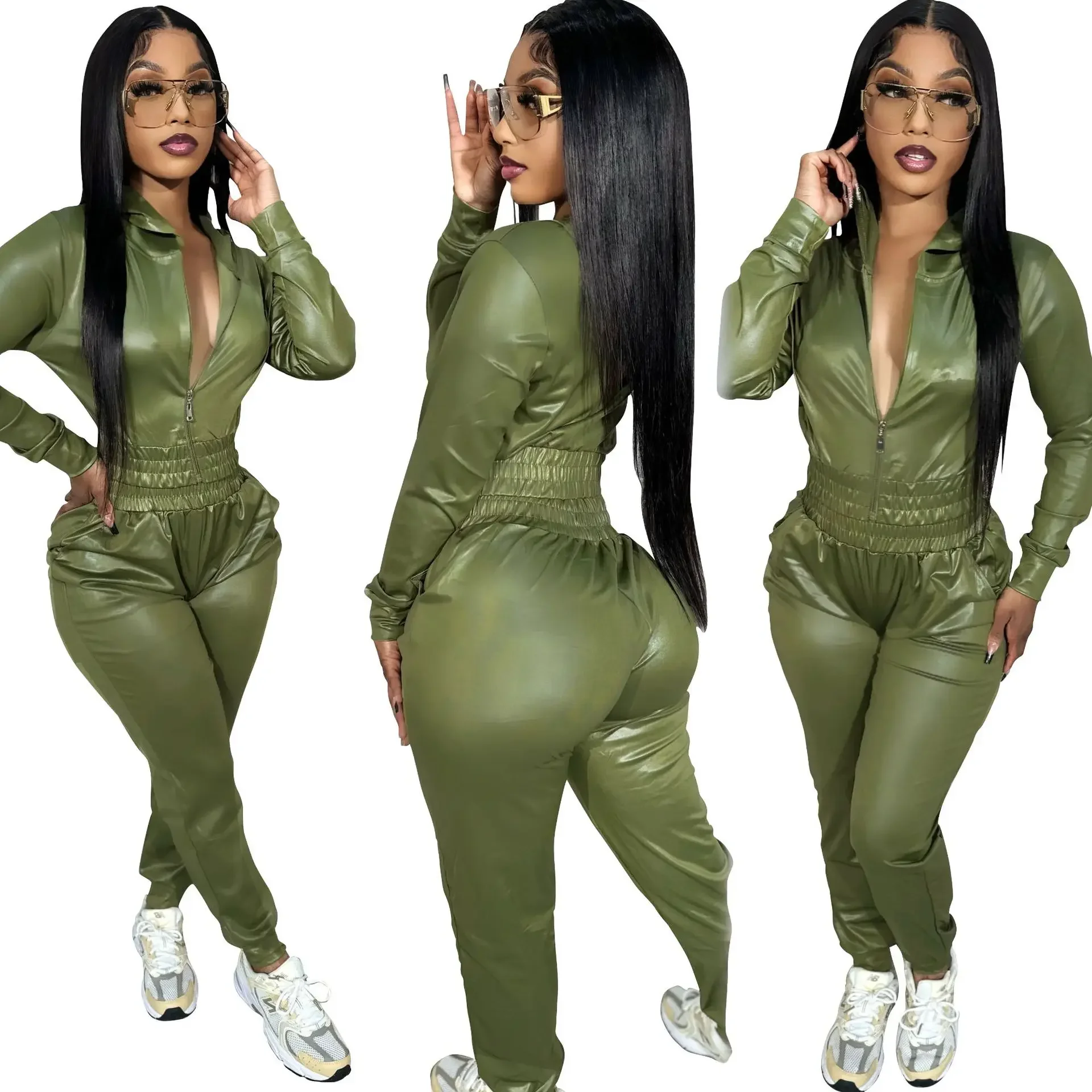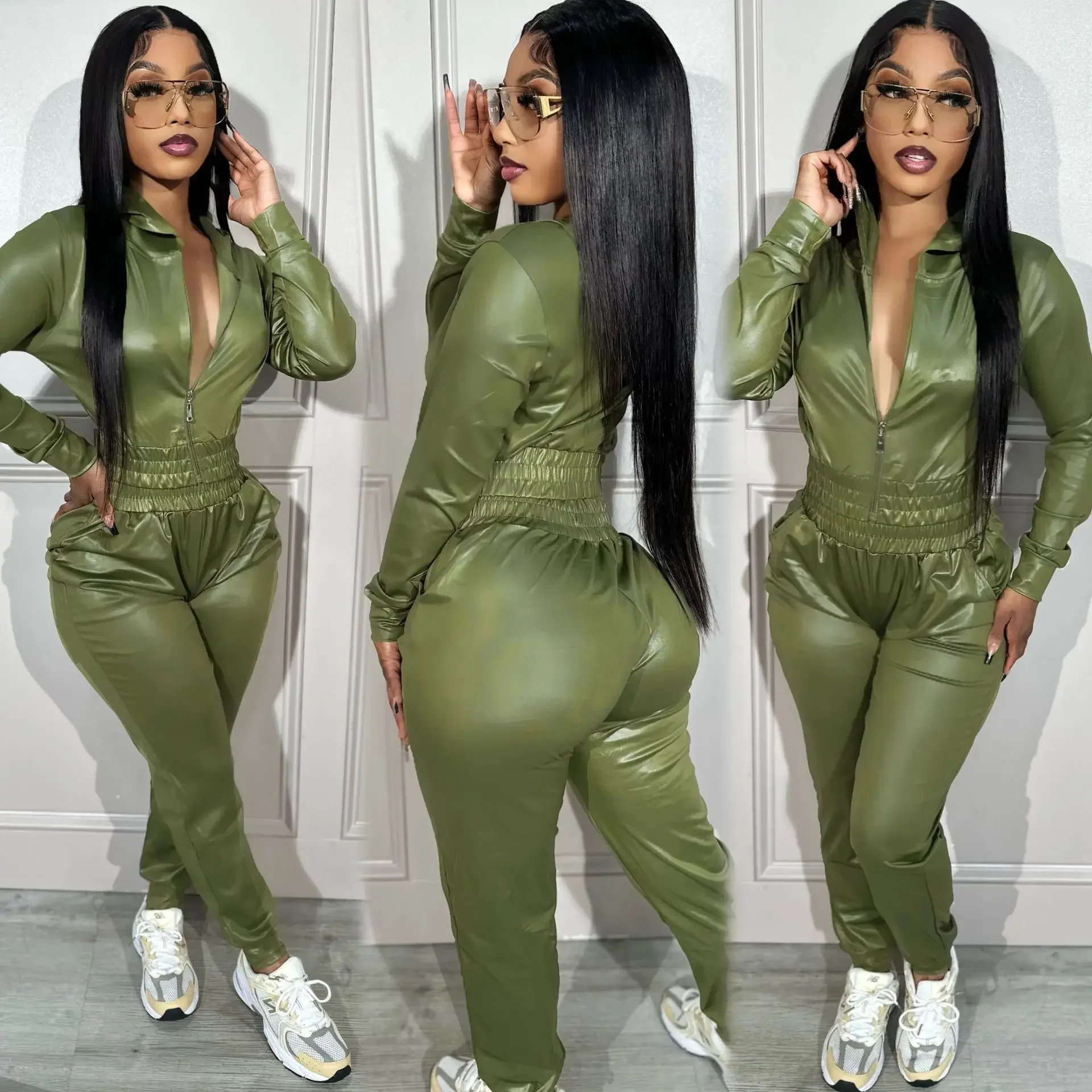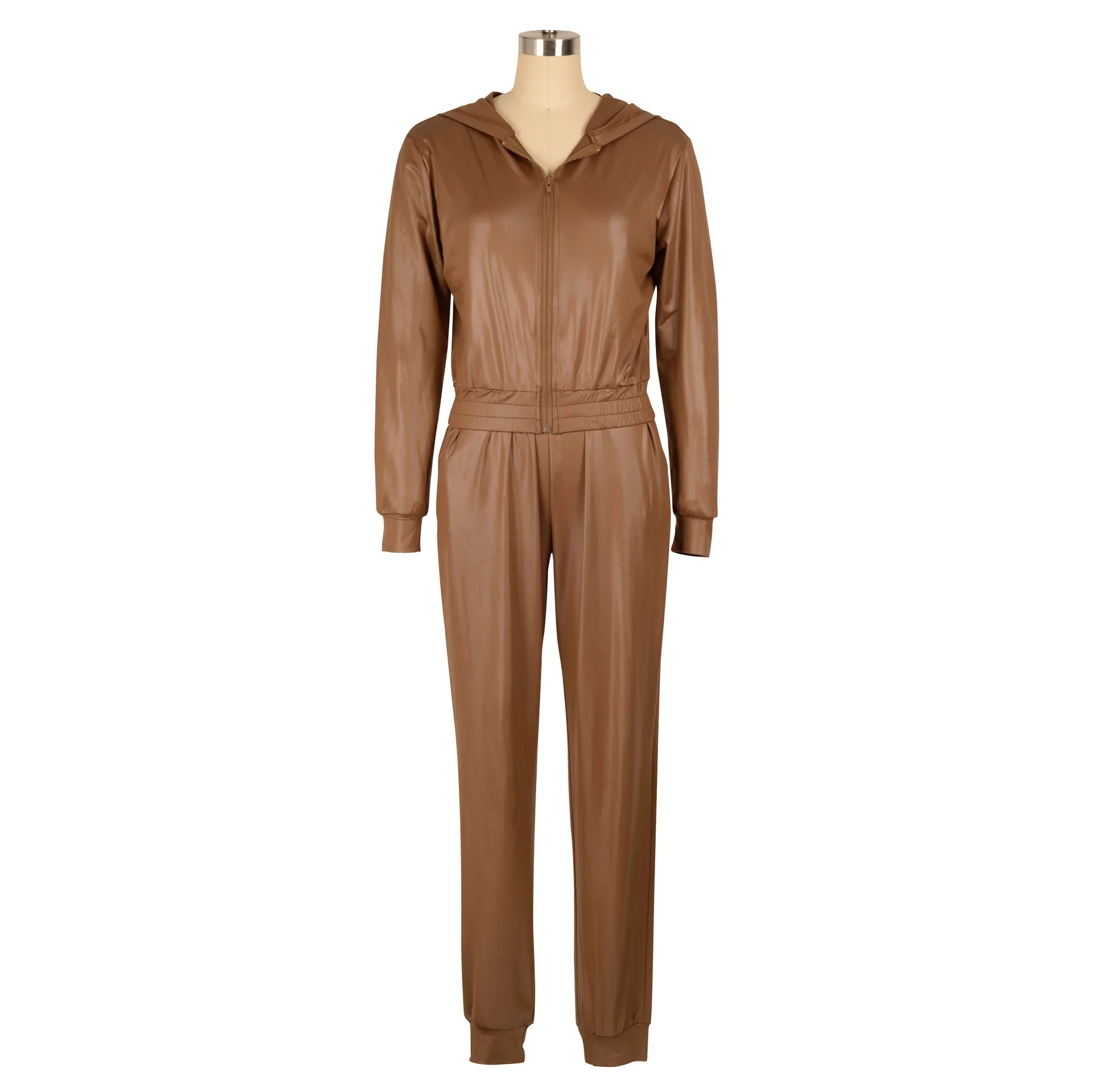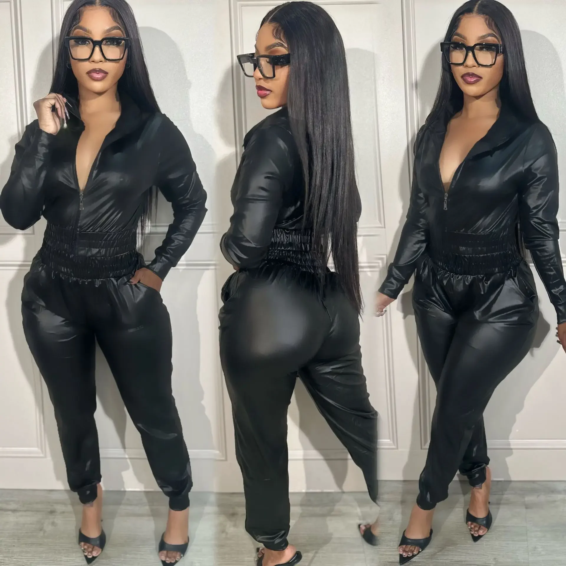 Elevate your street style with our exclusive Chic PU Faux Leather Two Piece Set! This matching set features a long sleeve, zipper hooded jacket and sleek pants, a perfect ensemble for any fashion-forward woman.
