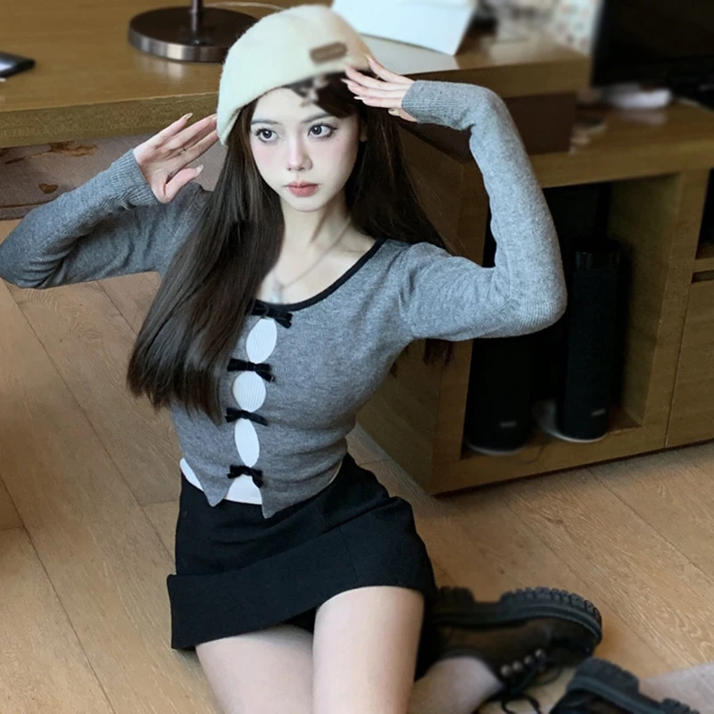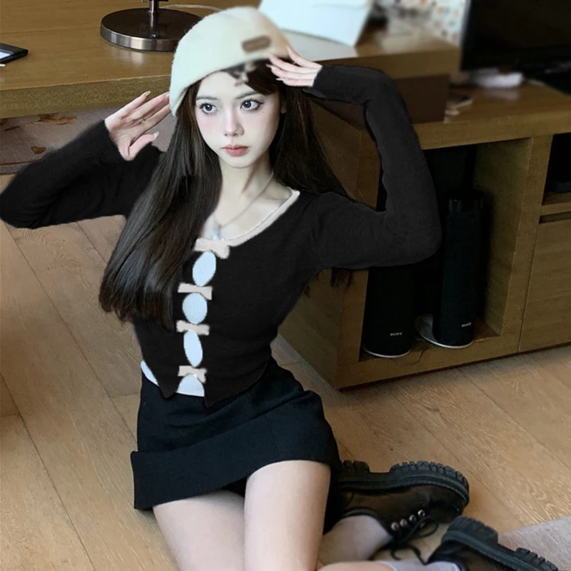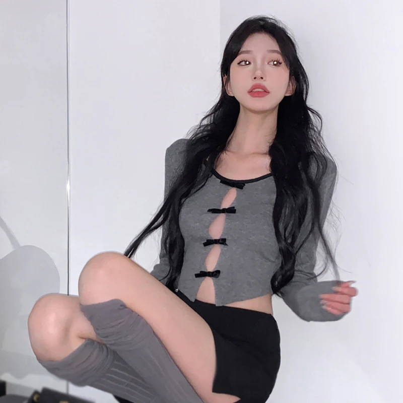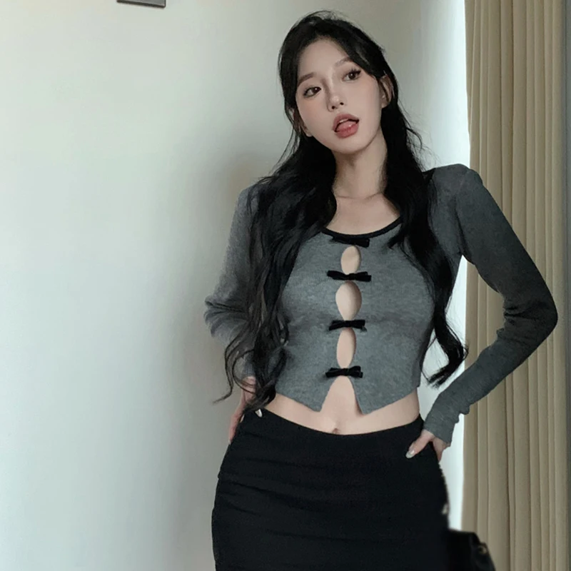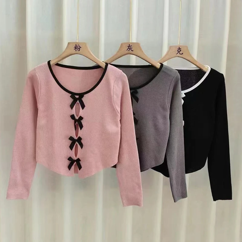 Spring Y2k Sweater Crop Tops Sweet Cropped Pullovers Women's Clothing O-neck Tunic Jumper Hollow Out Bow Pull Femme Knit
